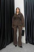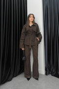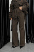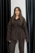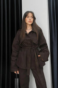Haut : manches longues, col multicouche, boutons cachés, poches latérales, ceinture intégrée