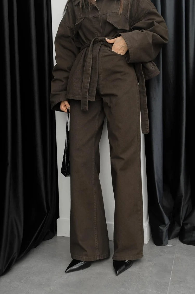 Bas : taille haute, zip frontal + bouton métal, 5 poches