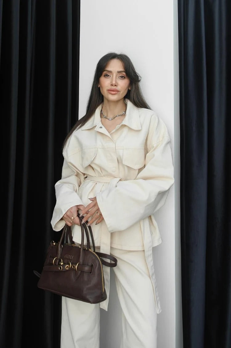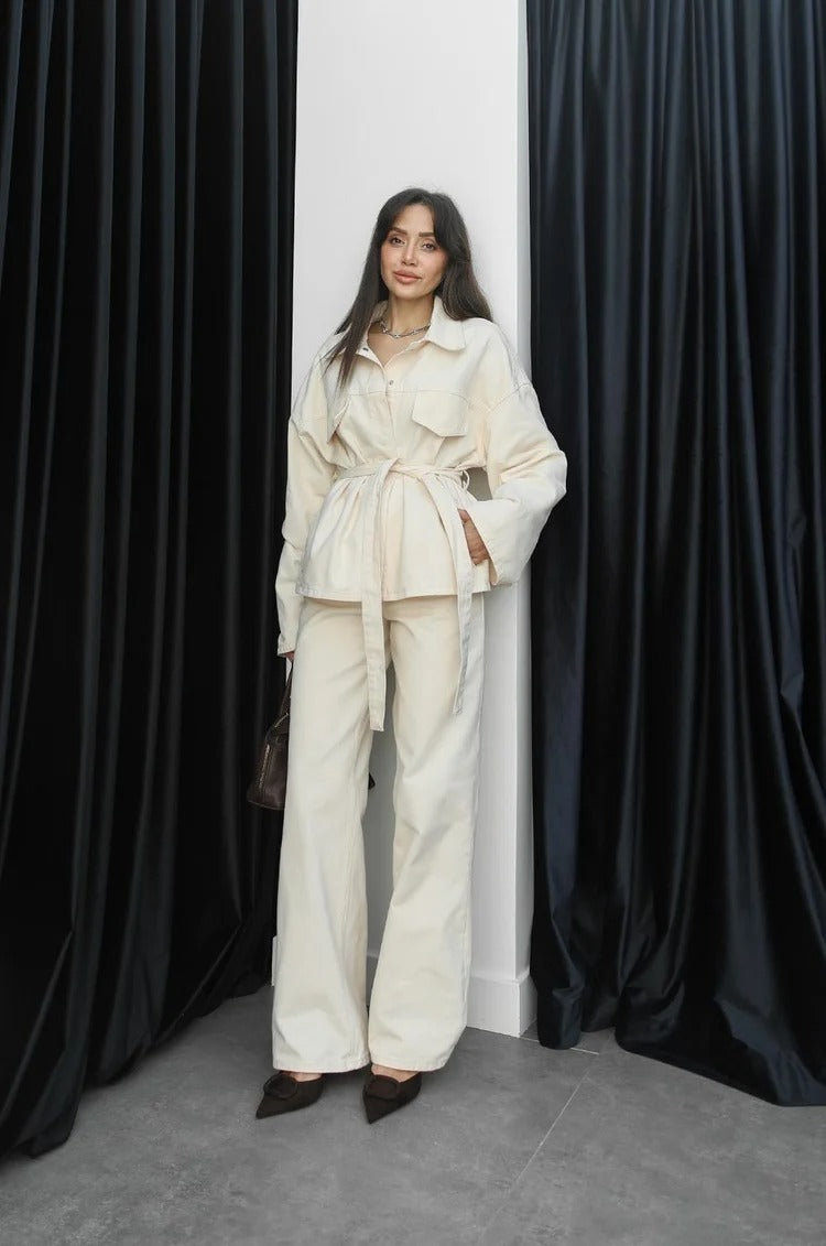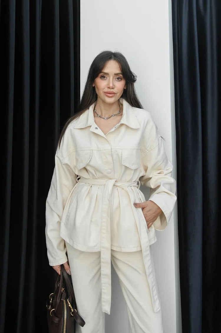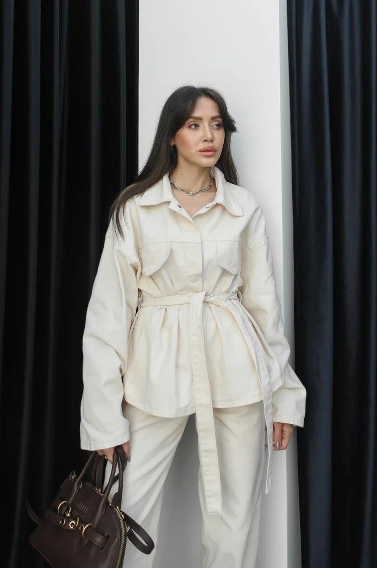 Haut : manches longues, col multicouche, boutons cachés, poches latérales, ceinture intégrée